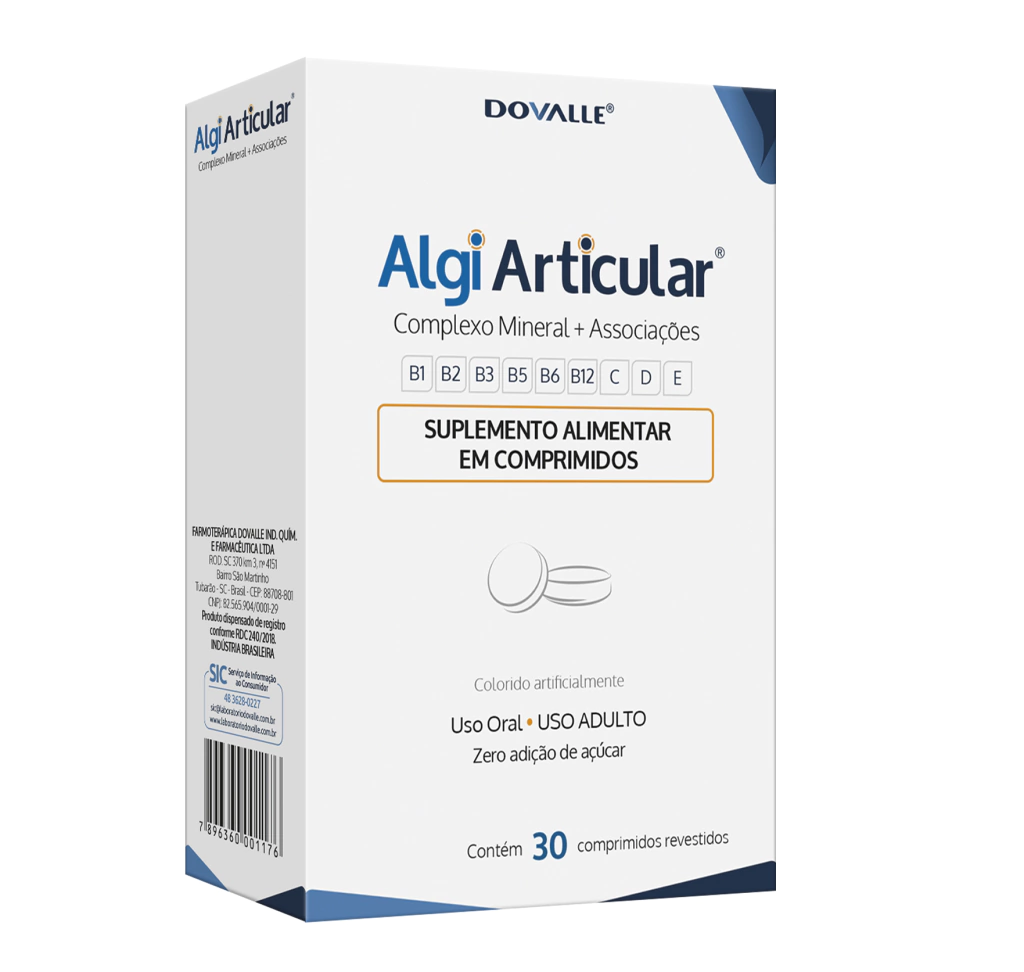 Algi Articular — frasco com 30 comprimidos revestidos. Uso oral. Embalagem prática para rotina diária.