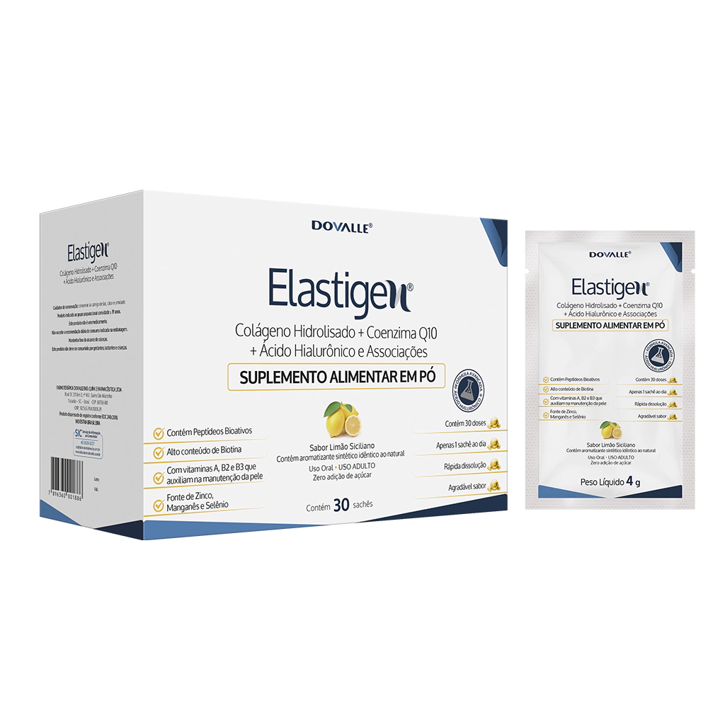 Elastigen — 30 sachês de 4 g, sabor limão siciliano. Suplemento em pó em porções individuais, pronto para diluir, com sabor cítrico e refrescante.